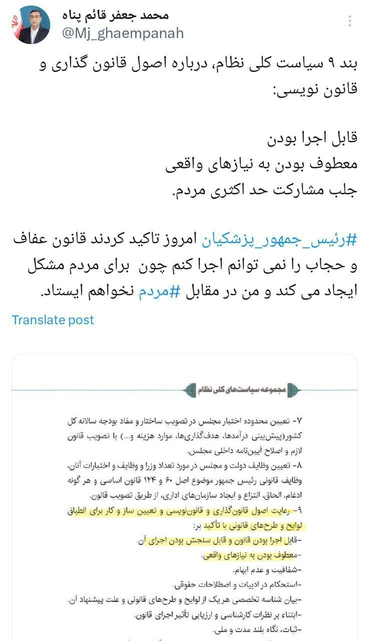 تا به حال هیچ‌کس مانند جعفر قائم پناه در رد این قانون بی ربط به چنین بندی استناد نکرده بود و واقعا یک برگ برنده رو کرده است.  ‌دکتر پزشکیان هم البته نگفته اجرا نمی‌کنم بلکه گفته نمی‌توانم اجرا کنم. در جمله بعد اما نگفته نمی‌توانم مقابل مردم بایستم. اینجا گفته در مقابل مردم نخواهم ایستاد. بدین ترتیب آن “نمی‌توانم” نه نشانۀ ناتوانی که از سر اراده است.